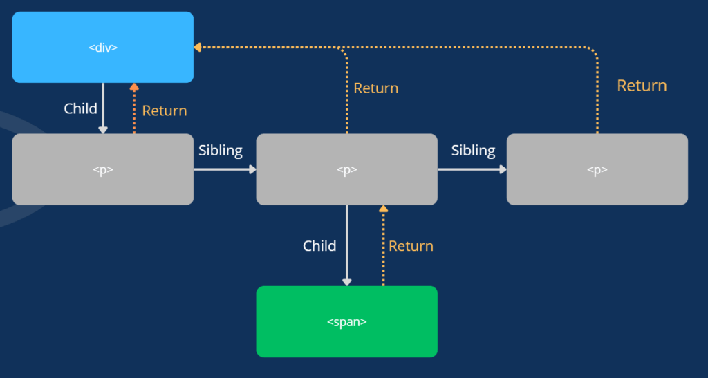 Poniżej prezentuję jak wygląda prosta struktura Fiber dla kawałka kodu HTML: