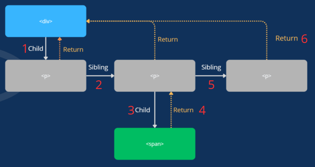 Praca w środku Reacta jest wykonywana wewnątrz pętli workLoop, która iteruje po kolejnych jednostkach pracy. Dla każdego z węzłów wywoływane są dwie kluczowe funkcje – beginWork oraz completeWork. Funkcja beginWork odpowiada za przetwarzanie danego węzła Fiber, wywołuje funkcję komponentu, tworzy lub aktualizuje dzieci węzła, porównuje wynik z poprzednim drzewem oraz ustala, jakie zmiany należy wprowadzić w kolejnej fazie. Funkcja completeWork jest wywoływana po przetworzeniu wszystkich dzieci węzła i odpowiada za końcowe obliczenia dla danego Fiber, przygotowując efekty do commit phase oraz scalając efekty dzieci w tzw. effect list. Dzięki takiej organizacji React może wstrzymać pracę w dowolnym momencie i wznowić ją później, co pozwala obsłużyć zadania o wyższym priorytecie bez blokowania interfejsu.