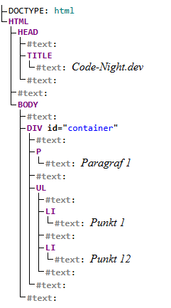 Każdy element kodu HTML ma swoje odzwierciedlenie w węzłach (ang. nodes), które z kolei mogą zawierać swoje atrybuty, tekst, czy nawet inne węzły. Poniżej znajduje się przykładowy kawałek kodu HTML oraz jego odzwierciedlenie w strukturze drzewa DOM: